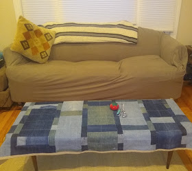 One of the more substantial projects I have completed in the past few years was a quilted tablecloth for our coffee table. Way back before we had a child, we left the table bare. But alas the child came along and quickly scratched and dented the table forcing us to cover it. Of course, we didn't have a coffee-table-sized cloth so we folded a sheet to fit the table and put binder clips around the edges in an attempt to keep it on the table. As you can see, that didn't work so well.